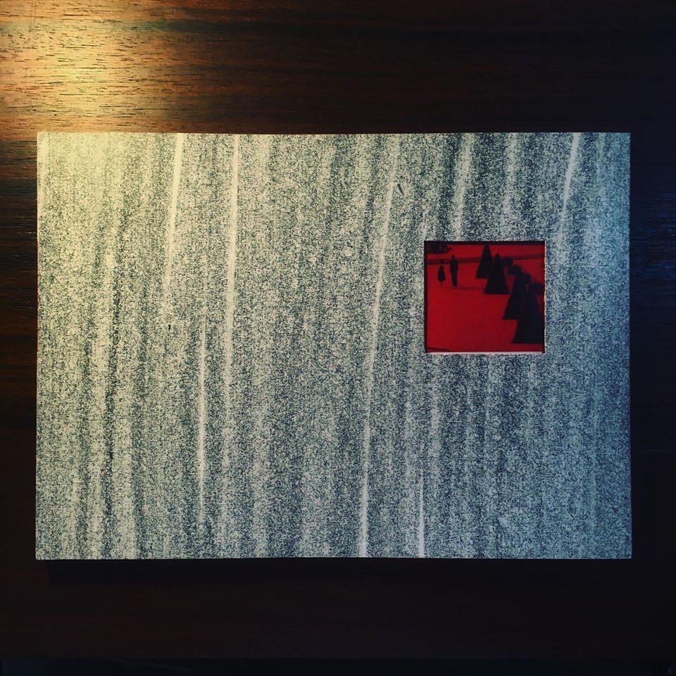 • Caixa cinza com janela vermelha quadrada sobre mesa de madeira