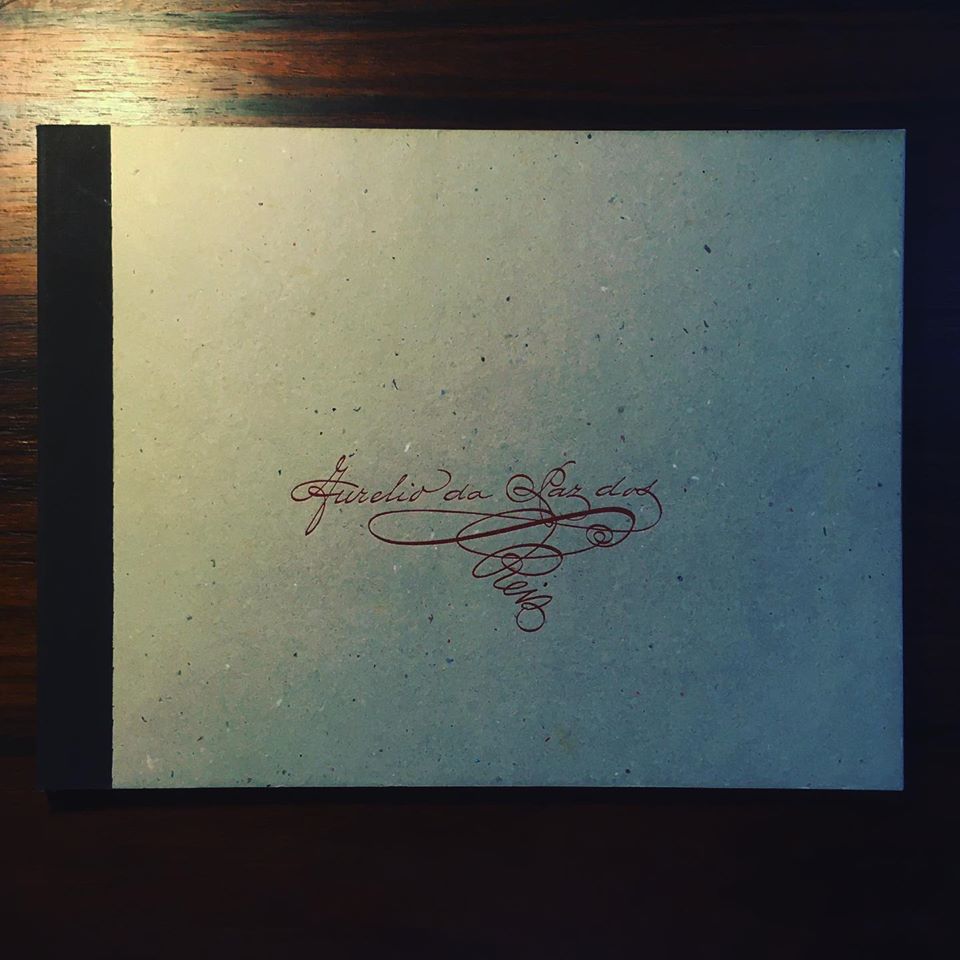 Caderno bege com lombada preta e texto manuscrito vermelho no centro da capa
