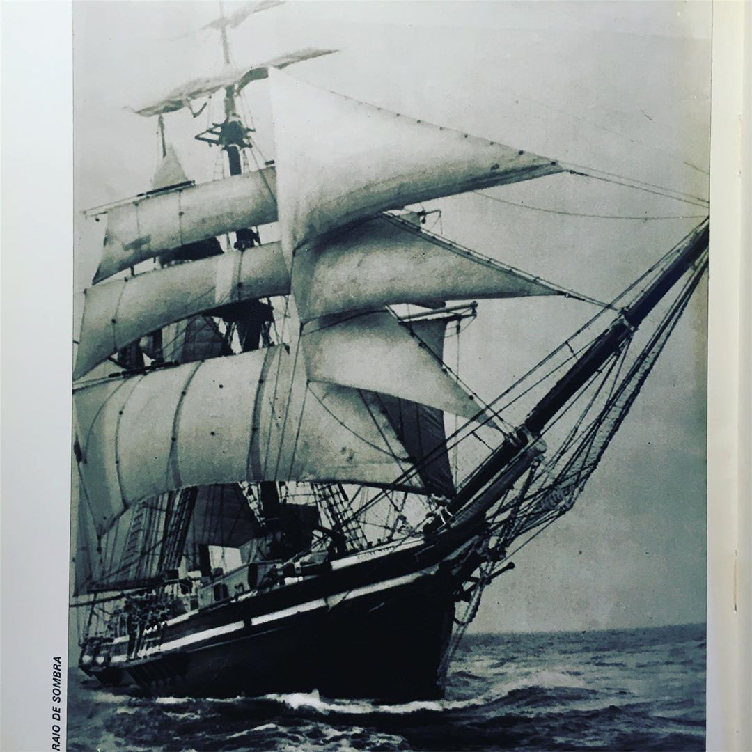 • Fotografia a preto e branco de um veleiro clássico em alto mar com velas içadas