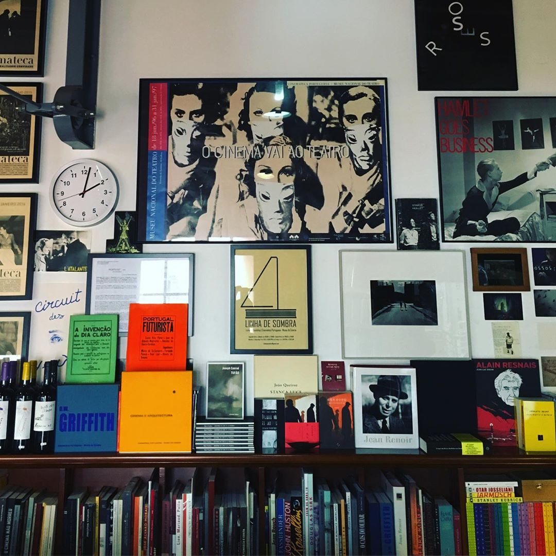 • Parede com diversos quadros de filmes e livros, estante com livros coloridos e relógio branco