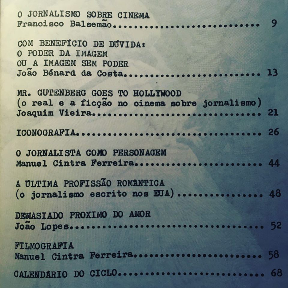 JORNALISMO E CINEMA • Organização de João Bérnard da Costa • 1993 Cinemateca Portuguesa 71 pgs 60 fotos p/b • Textos de Francisco Balsemão, João Bénard da Costa, Joaquim Vieira, Manuel Cintra Ferreira & João Lopes • Filmografia sobre a temática do jornalismo • Direcção Gráfica de Luís Miguel Castro • Livro disponível na Livraria Linha de Sombra • Cinemateca Portuguesa-Museu do Cinema ◼︎