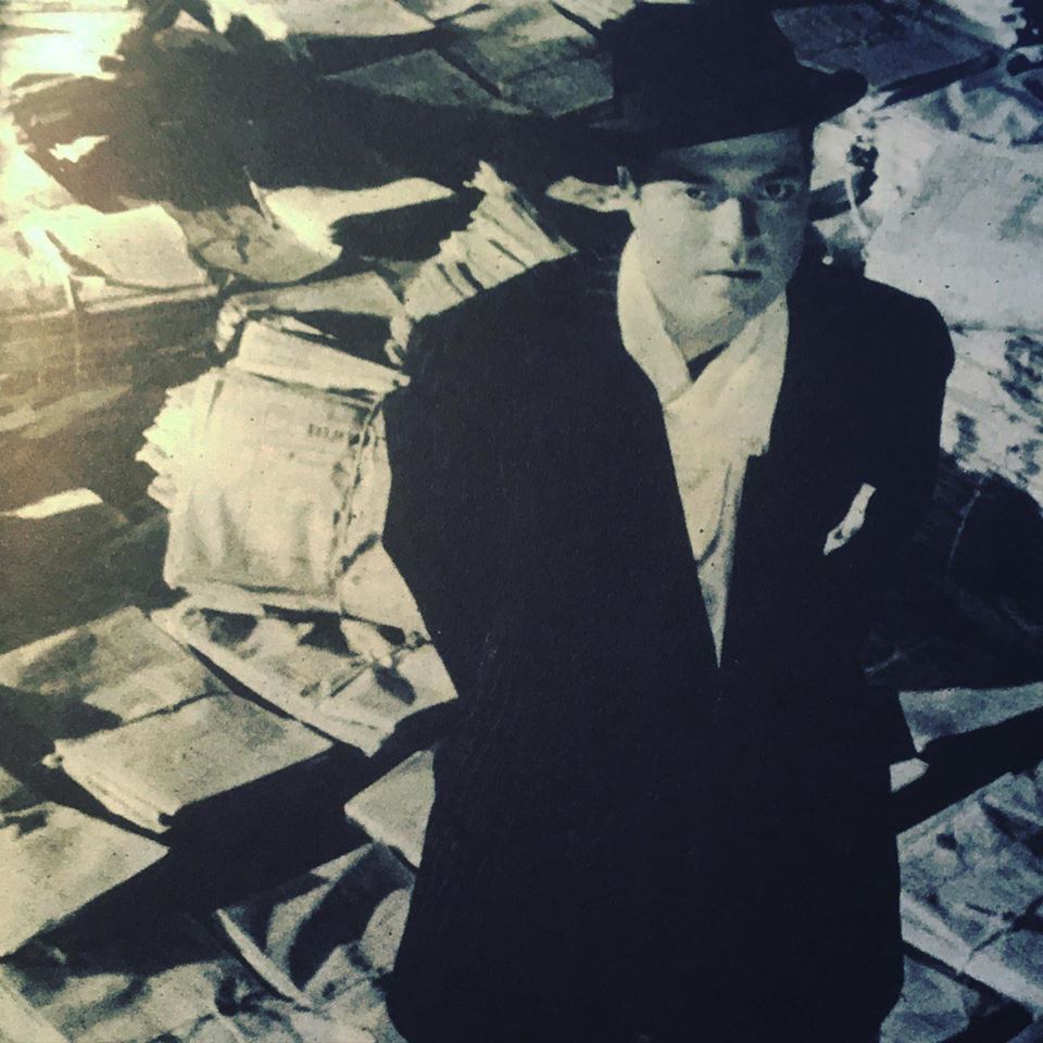 • Homem de fato preto e chapéu num espaço com muitos papéis no chão