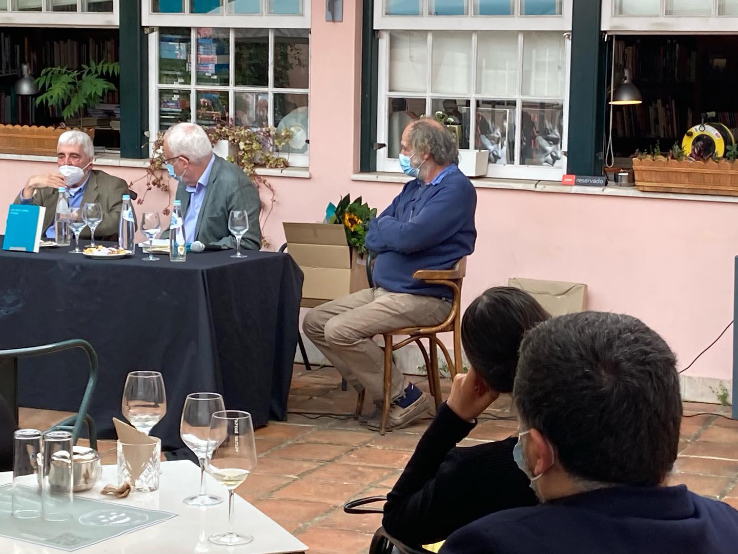 • Pátio exterior com homens sentados à mesa e em cadeira, parede rosa com janelas