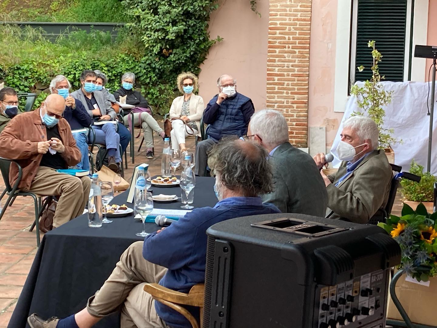 • Reunião ao ar livre com pessoas usando máscaras, mesa com bebidas e petiscos, equipamento de som e parede com vegetação.