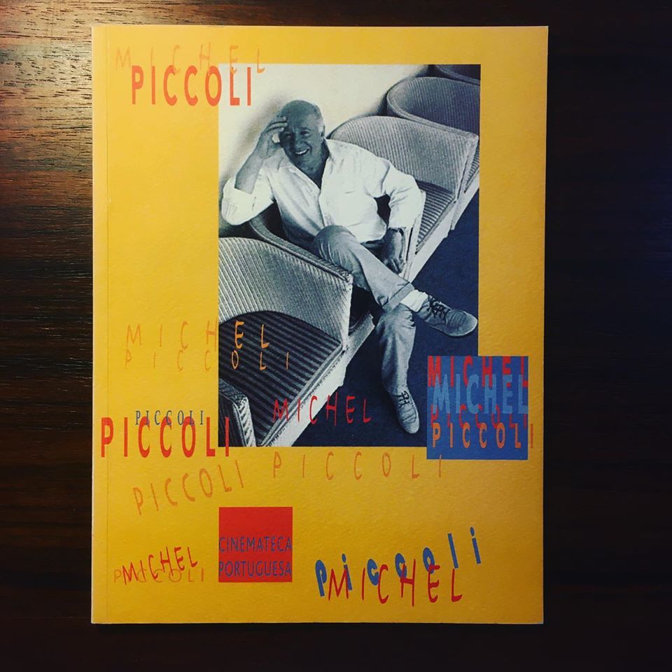 • Capa amarela com foto a preto e branco de homem sentado, textos MICHEL PICCOLI e CINEMATECA PORTUGUESA