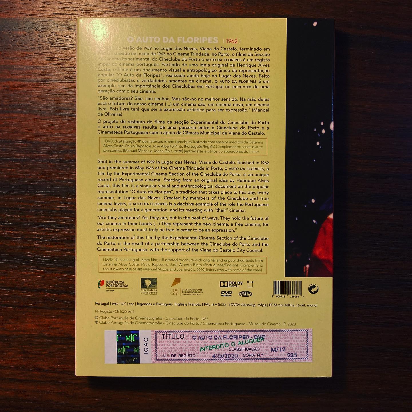 O AUTO DA FLORIPES 1962 • Secção de Cinema Experimental do Cineclube do Porto • 2020 Cinemateca Portuguesa / Clube Português de Cinematografia 57 min • 1 DVD; digitalização 4K de restauro em 16mm; 1 documentário com entrevistas a diversos colaboradores do filme assinado por Manuel Mozos & Joana Góis, assinalando a produção deste documentário histórico; 1 brochura ilustrada de 107 páginas com textos em português e inglês com ensaios inéditos de José Alberto Pinto (I2ADS, FBA-UP), Catarina Alves Costa (CRIA, FCSH-UNL), Paulo Raposo (CRIA, ISCTE-IUL) & Tiago Baptista (CP-MC) com Mafalda Melo & Carlos Almeida • O projeto de restauro de O AUTO DA FLORIPES iniciou-se em 2019, numa parceria entre o Cineclube do Porto e a Cinemateca Portuguesa com o apoio da Câmara Municipal de Viana do Castelo. Este projeto consiste no restauro, digitalização e edição em DVD do filme, protegendo-o e tornando-o mais acessível através da sua digitalização. Insere-se no contexto de um projeto maior de valorização do património e acervo do Clube Português de Cinematografia - Cineclube do Porto. O filme fica igualmente disponível a partir de agora para sessões em sala em formato DCP • Edição do DVD disponível na Livraria Linha de Sombra • Cinemateca Portuguesa-Museu do Cinema ◼︎