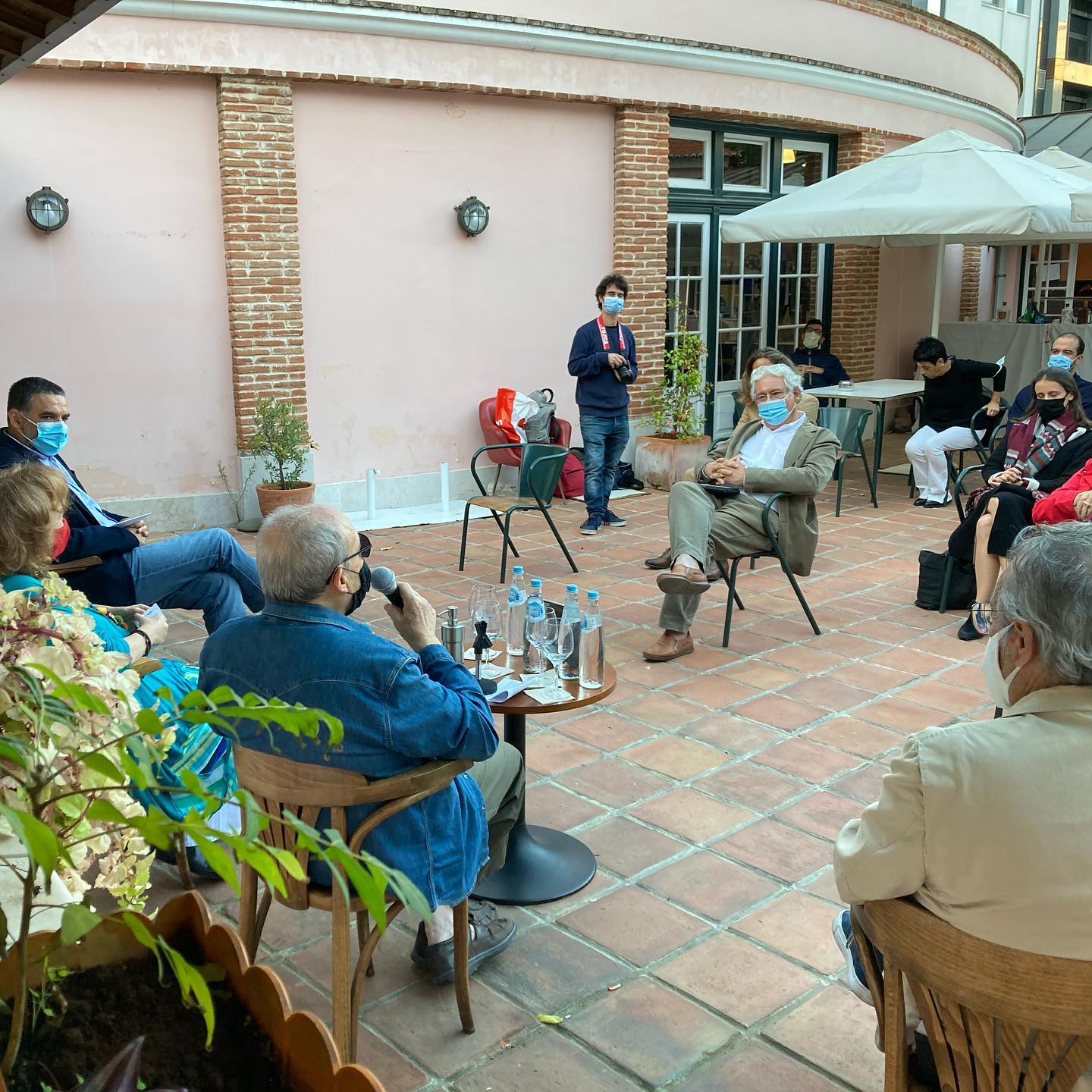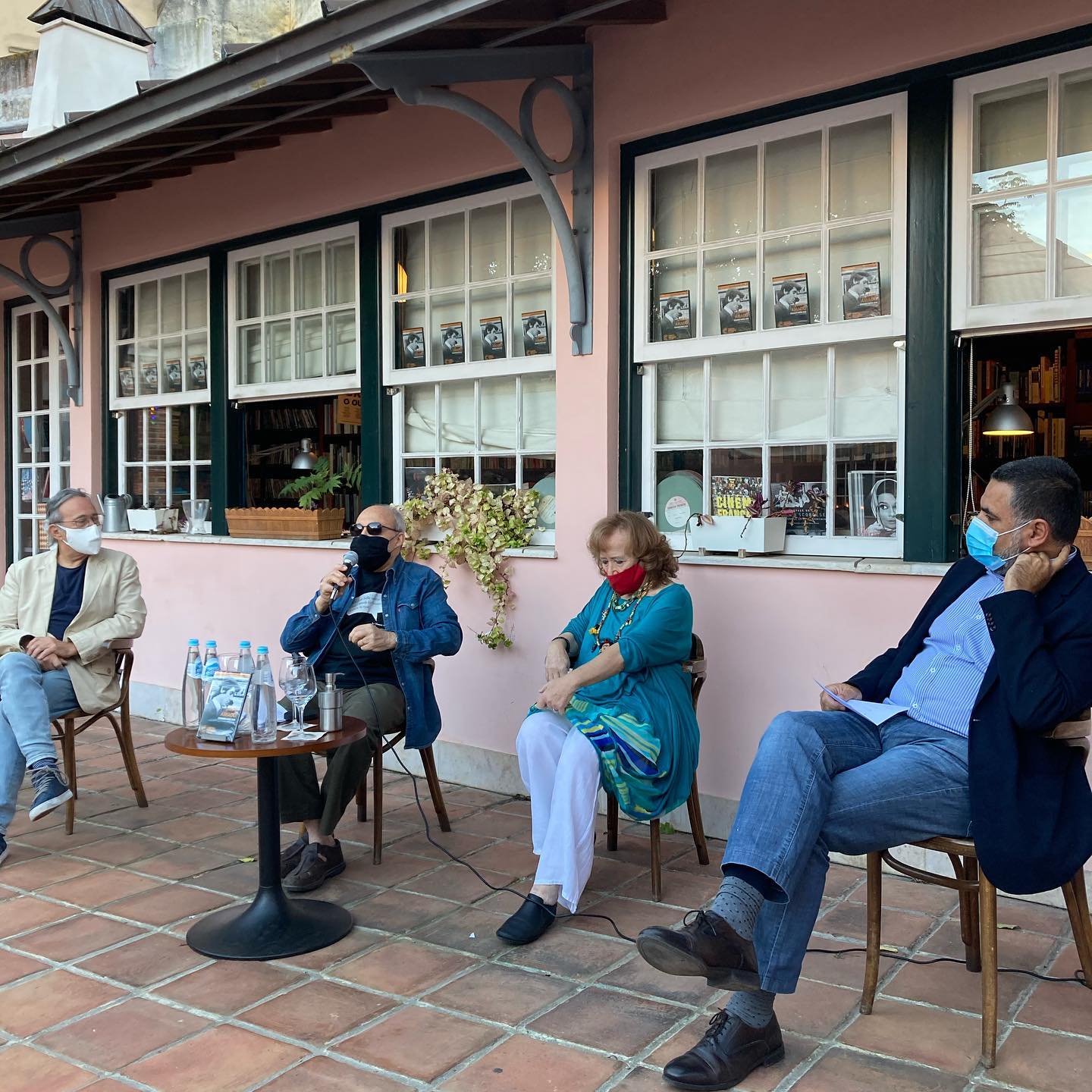 • Quatro pessoas sentadas com máscara num terraço com chão de ladrilhos e parede rosa com janelas verdes