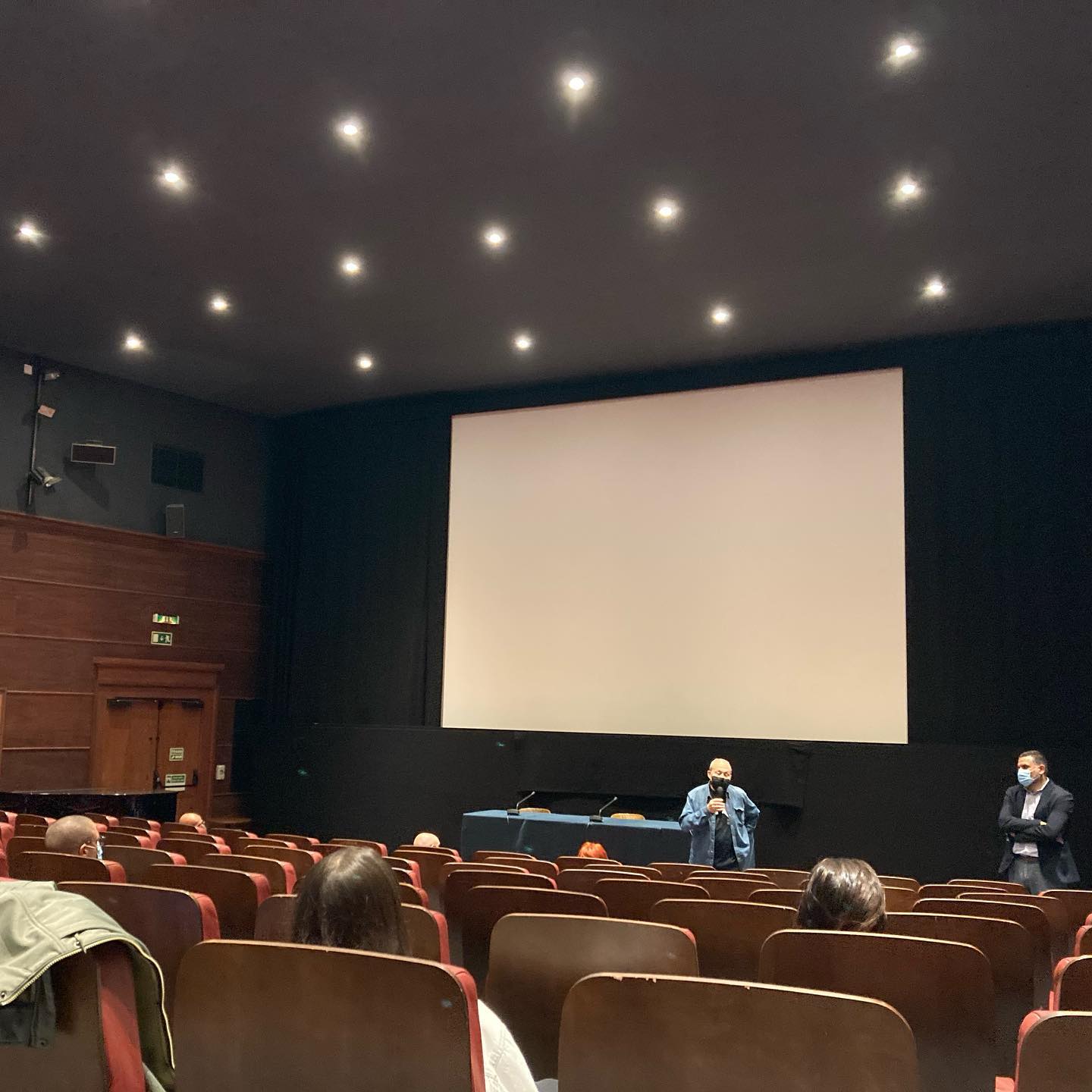 • Sala de cinema ou auditório com cadeiras de madeira e tela de projeção branca