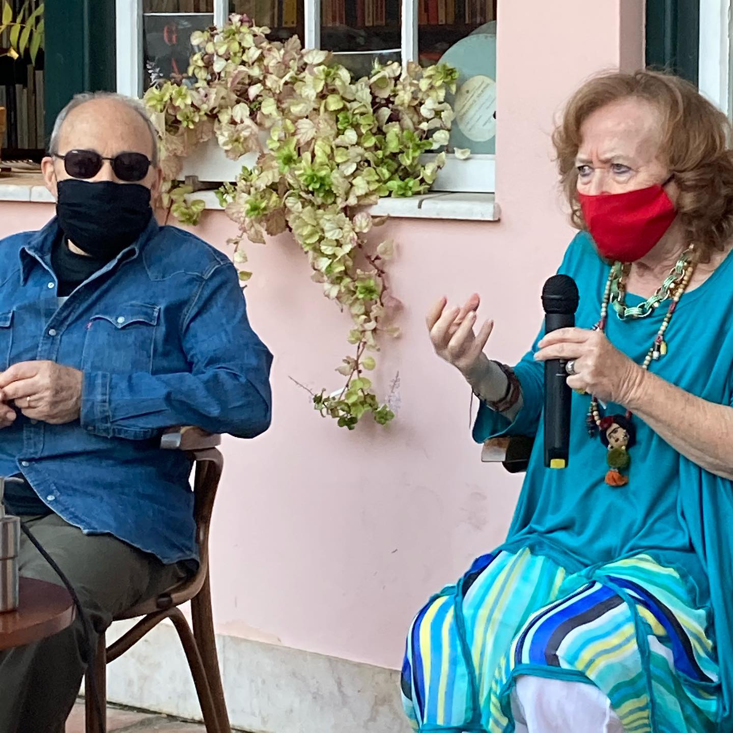 • Dois adultos sentados com máscaras, homem de jeans e mulher vestida colorida falando num microfone