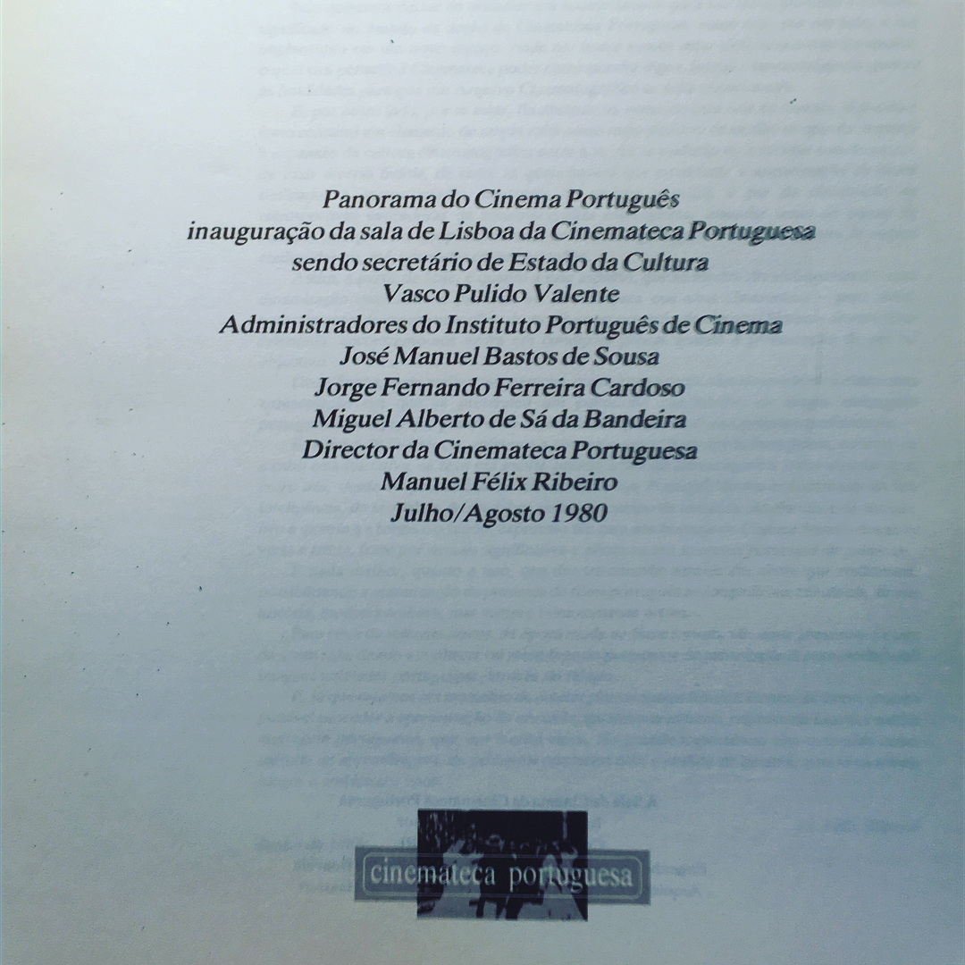 PANORAMA DO CINEMA PORTUGUÊS • Organização de M. Félix Ribeiro • 1980 Cinemateca Portuguesa • Catálogo editado por ocasião da inauguração da Sala de Cinema da Cinemateca Portuguesa em Maio de 1980 • A Sala de Cinema da Cinemateca Portuguesa foi construída em 61 dias por Construções Técnicas SARL • Engenheiro responsável João Manuel Gormicho Boavida • Arquitecto Joannes Franciscus Henriques Van Haastert • Design de Kátia Ribeiro ● Exemplar disponível na Livraria Linha de Sombra • Cinemateca Portuguesa-Museu do Cinema ■